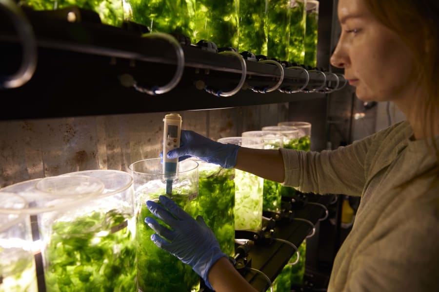 Her vokser søsalaten under ekstremt veltilpassede forhold, fordi højteknologiske løsninger sørger for, at der er de rette lysforhold, temperaturer og næringsstoffer i tankene.